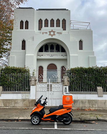 The Hatzlalah Portugal motorcycle in front of the Kadoorie Mekor Haim Synagogue. Credit: CIP/CJP