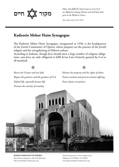 Decade and a half ago, when the Jewish Community of Porto conceived a plan to attract visits from schools throughout the country, as well as non-Jewish tourism in general (which was subsequently prohibited for security reasons), a pamphlet containing the Sheva Mitzvot began to be distributed to each visitor.